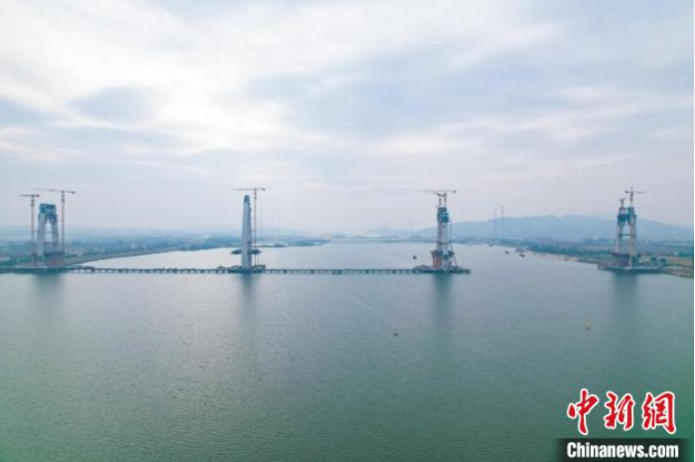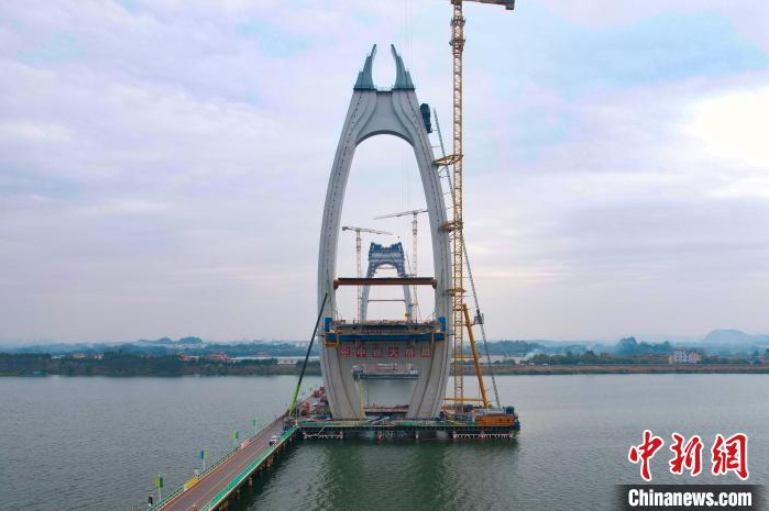 中新社清遠12月25日電 (蔡敏婕 周順)粵港澳大灣區工程清花高速(清遠清新至廣州花都高速公路)北江特大橋首個主塔25日封頂。