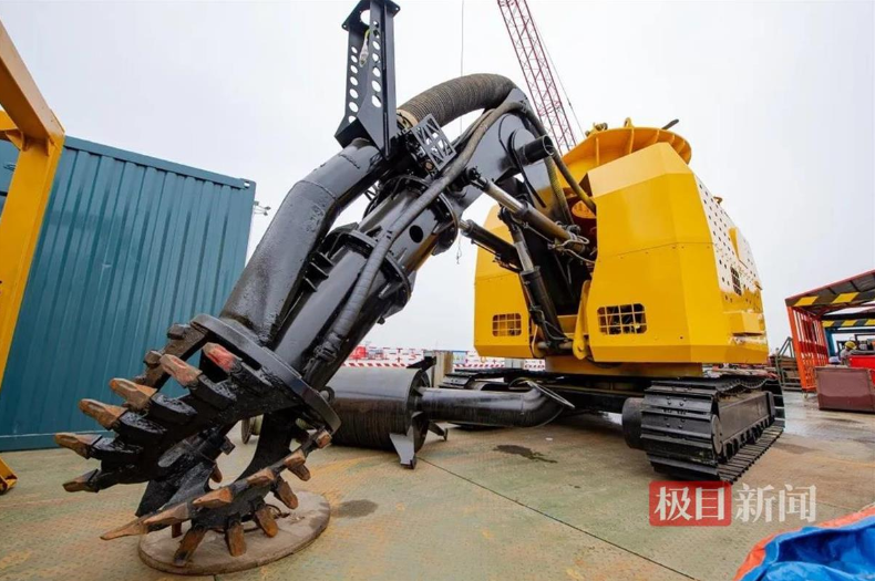 記者注意到,它的外形像個(gè)坦克,前端是一個(gè)液壓絞吸頭,履帶輪可以在高低不平的水底平穩(wěn)前行。